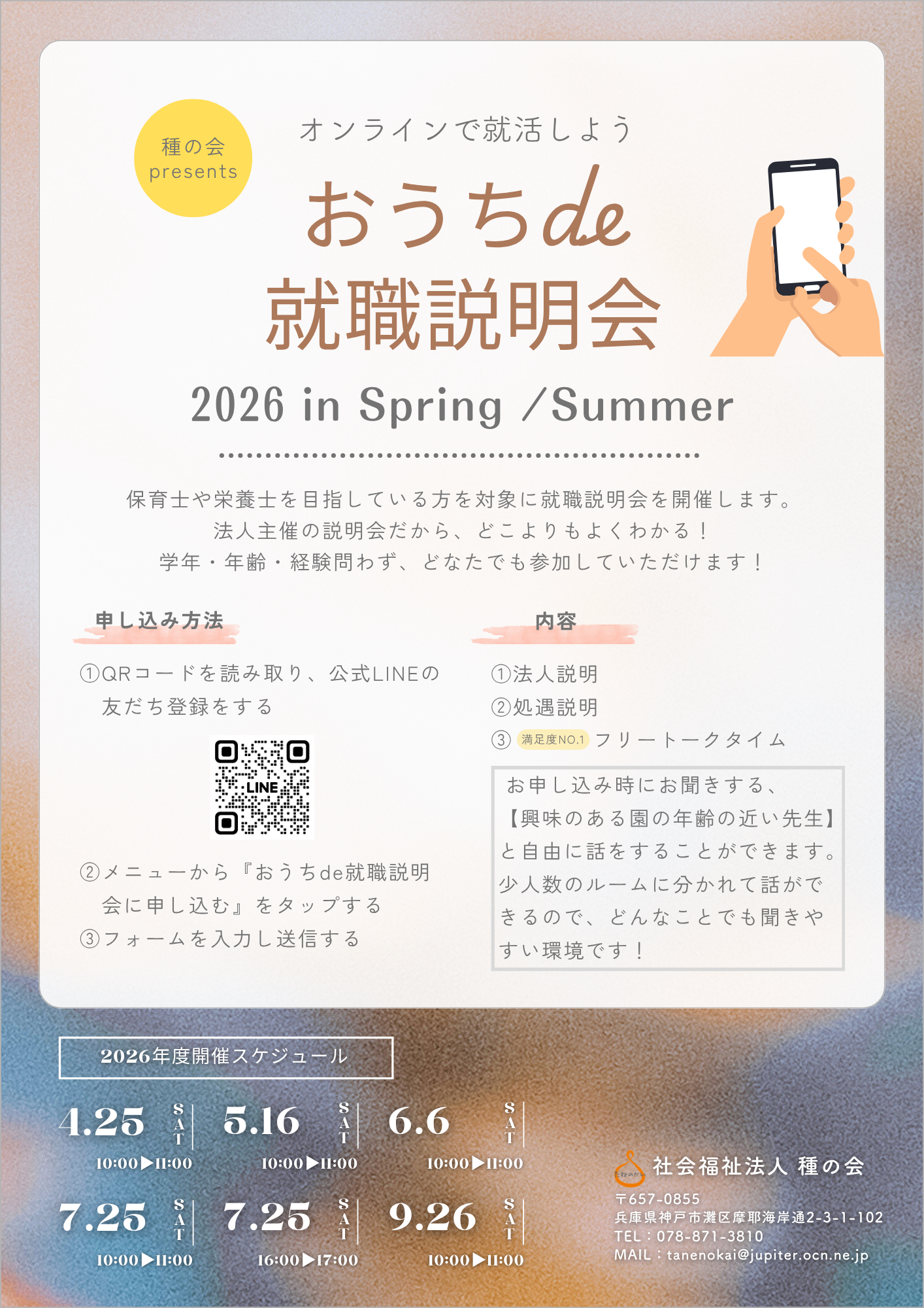 こども園や保育園、小規模園、児童館で働きたい方に向けて、オンライン就職説明会を開催します。