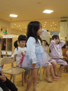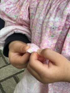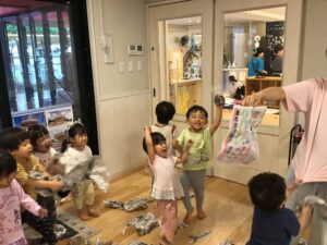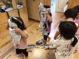 新聞紙をちぎって遊びました。音楽(おばけなんてないさ)をかけると「おばけ~つくって」とリクエストがあり新聞紙おばけを作ると「きゃー」と大盛り上がり!その後は自分で新聞紙に目の穴をくり抜いておばけのお面を作っていました。それをみて他の子も一緒におばけのお面をつくって行進したいと子どもの発想が素敵でした。