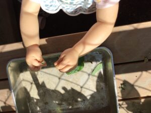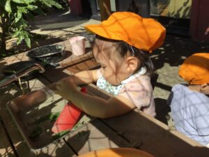 園庭にあるアルテキッチンで葉っぱをちぎってみたり……