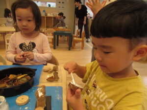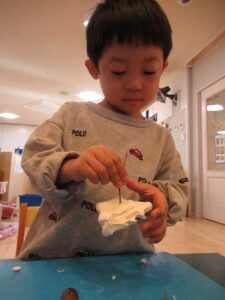紙粘土を接着剤のように使い、松ぼっくりにどんぐりの耳を付けたのです。