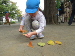 寒くなってきました!公園の木々の葉っぱも色づいて、きれいな葉っぱを集めるのが楽しい季節になりました。