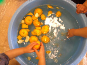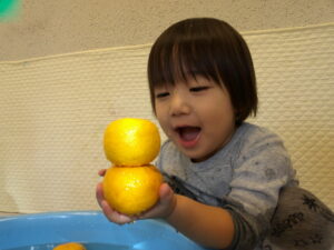 12月22日は冬至でした。冬至と言えば、ゆず湯のイメージがあったので、ゆず湯の雰囲気だけでも楽しめないかと考えて、水遊びならぬ”お湯遊び”をしました。
