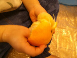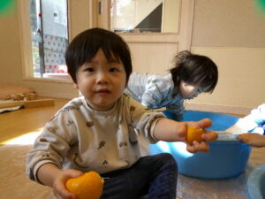 日頃から園庭の夏みかんで遊んだり、からすうりやザクロで遊んだりと、生の実に触れて自由に遊んでいたので、今回も思い思いにゆずで遊んでいました。