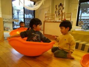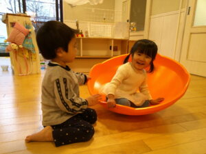 少人数で遊んでいたある日の午後。この日はミニ・トップという、ゆらゆら揺れたりクルクルと回ったりするおもちゃで遊びました。