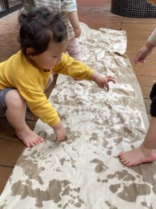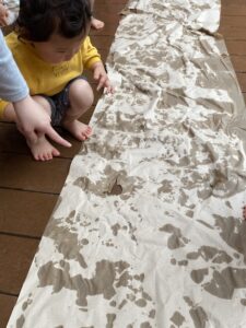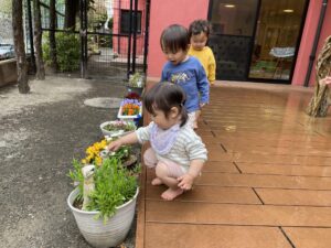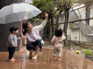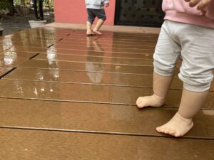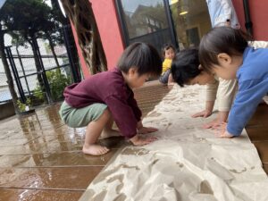 活動ブログ: 2026年 4月 幼保連携型認定こども園 アルテ子どもと木幼保園 > 活動ブログ > 2026年 > 4月 雨で感じるもの(1歳アト組・2歳ピコ組) 2026年4月1日 水曜日カテゴリー: 園の取り組み 春の気配を感じつつある雨の日。 子ども達と一緒にテラスに出て”雨”に触れて遊びました。 足裏から冷たさを感じて、にっこり。乾いた床の上を歩くと、模様が出てきて「あっ!」 雨で濡れた花に気づいて、お友達も気付き、一緒に見ました。 塗れたテラスの上に紙の緩衝材を載せ、手や足で触りました。 触ると、じわっと色が変わり、面白い! 見て、触って、”雨”を感じました。
