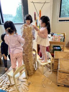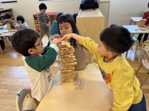 新しいグループでカプラを積み上げ競争をしました。始めは一人で積み上げるのに集中している子ども達。