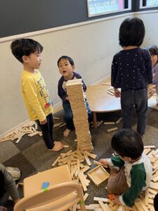 競争終了後は「もっとカプラやりたい!」となり、友達と一緒にもっと高く積み上げるのことに挑戦しました。