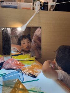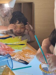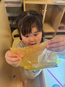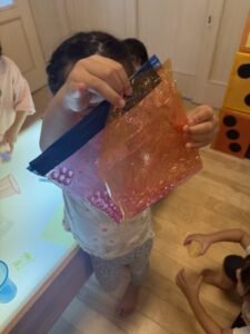 透明シートを使ってトンネルを作りました。上から水をかけると「わぁ~」と歓声が上がりました。水が勢いよく流れる様子をみんなで楽しみました。