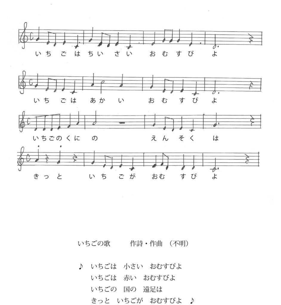 「昔、幼少のころ 叔父が “いちごのうた”をうたってくれたこと、その時いちごがおにぎりなんて変だなと思ったこと」数十年前の記憶が思い出され、今でもとても印象に残っている。叔父は詩人であったので懐かしく嬉しい気持ちで胸がいっぱいになりました。・・・・と