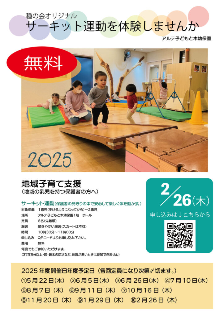 お知らせ: 園児募集 幼保連携型認定こども園 アルテ子どもと木幼保園 > お知らせ > 園児募集 園児募集状況【令和8年2月1日現在】 2026年2月1日 日曜日カテゴリー: 園児募集地域の方子育て支援 2026年4月入園枠★新3歳(年少)クラス在園児転居の為保育園コースに2名の空きがでました。 2026年4月入園枠★新0歳クラスに1名の辞退がありましたので1名の空きがあります。 いずれも中野区の2次募集にお申込み下さい。(2月10日まで) 0歳児1歳児2歳児3歳児4歳児5歳児2・3号認定(保育園コース)×××××◯1号認定(幼稚園コース)ーーー××× 地域子育て支援(サーキット体験) 2026年1月31日 土曜日カテゴリー: 園児募集地域の方子育て支援 ソニー幼児教育支援プログラム 2025年度 保育実践論文 2026年1月28日 水曜日カテゴリー: 保護者の方園児募集地域の方 チャレンジ賞を頂きました。 2025年度 ソニー幼児教育支援プログラム 保育実践論文ダウンロード 園見学・子育て相談会11月〜2月お申し込みのご案内 2025年10月1日 水曜日カテゴリー: 保護者の方園児募集 オンライン見学会 2025年9月19日 金曜日カテゴリー: 園児募集子育て支援 このコンテンツはパスワードで保護されています。閲覧するには以下にパスワードを入力してください。 オンライン見学会(園の紹介ビデオ)視聴申し込み 2025年9月19日 金曜日カテゴリー: 園児募集子育て支援 入園をご希望される方で、園見学に参加できない方へ(内容は2024年度のものになります。ご了承下さい) 下記のリンクよりGoogleフォームでお申込み下さい。 ご回答後にパスワードが出ますので、オンライン見学会のページで入力してご覧ください。 https://forms.gle/HVVRFdhdpQ6XDBAN7 園見学・子育て相談会10月お申し込みのご案内 2025年9月16日 火曜日カテゴリー: 園児募集 10月の申込みはすべて定員となりました。次回以降の園見学会のお申込みは10月1日以降にUPします。 地域子育て支援(園庭開放・ランチ試食会) 2025年8月15日 金曜日カテゴリー: 園児募集子育て支援 気温が高い場合はテラスで水あそびをする予定です。水着は必要ありませんが、お着替えを一式お持ちください。 多くの方にご参加いただきたいので、応募が多数となった場合は初めての方が優先となります。 園見学・子育て相談会8月9月お申し込みのご案内 2025年7月1日 火曜日カテゴリー: 園児募集 9月までの会は定員となりました。10月の申込みは8月20日9時からとなります。 園見学・子育て相談会のお知らせ(2025年度) 2025年5月28日 水曜日カテゴリー: 園児募集子育て支援 7月までの園見学会はすべて定員となりました。次回は7月1日にご案内します。 1 / 41234»
