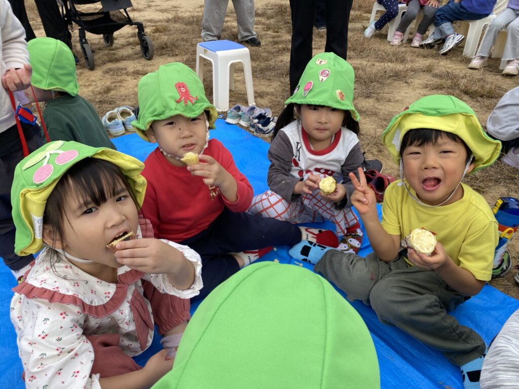 子ども達も交替でお客さんになり焼き芋を食べました。出来立てのお芋を手に取ると「あったかい!」「おいしい!」という声があちこちから聞こえ、湯気が立ちのぼるお芋を頬張る幸せそうな表情は、見ている人まで幸せな気持ちにしてしまうほどでした。