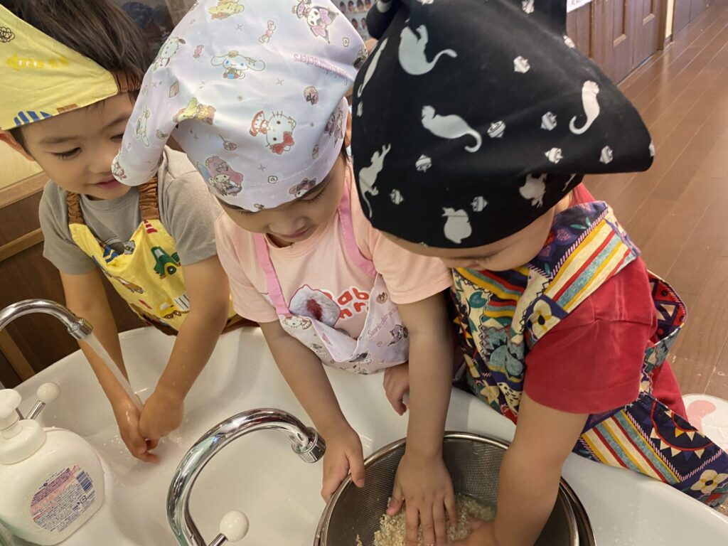 次に、グループに分かれてお米を洗います。子ども達は、洗っている内にに水がどんどん白くなることに興味を持ちながら、お米をこぼさないよう慎重に水切りをしていました。