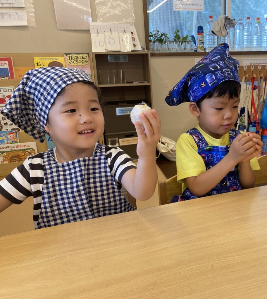 3歳児にじ組は、「コーンおにぎり」のクッキングを行ないました。