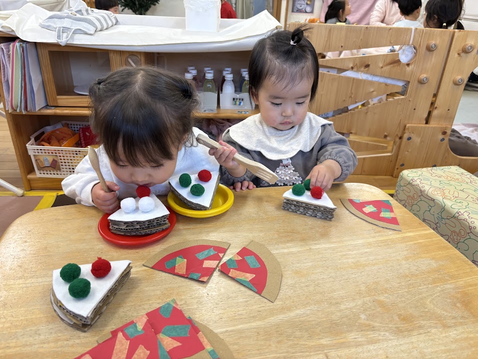 ケーキとピザで、クリスマスパーティーごっこをしました♪