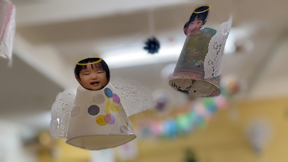 紙コップを使って、フィンガーペインティングをして天使の制作をしました👼
