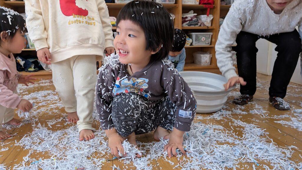 シュレッダーの紙片やパン粉で感触あそびも楽しみました!