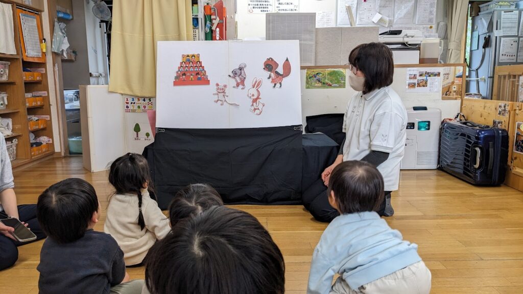 “動く・こどもの館号”さんが来てくれ、パネルシアターやふれあいあそびなどを行なってくださいました!みんな興味津々!