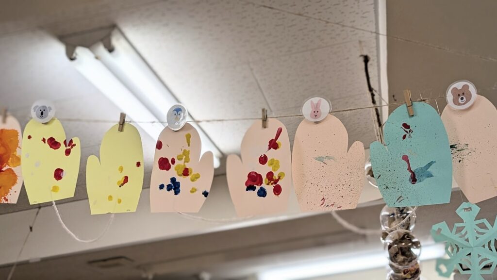 茶こしを使ったスタッパリングと、たんぽのスタンプで“てぶくろ”の制作をしました。