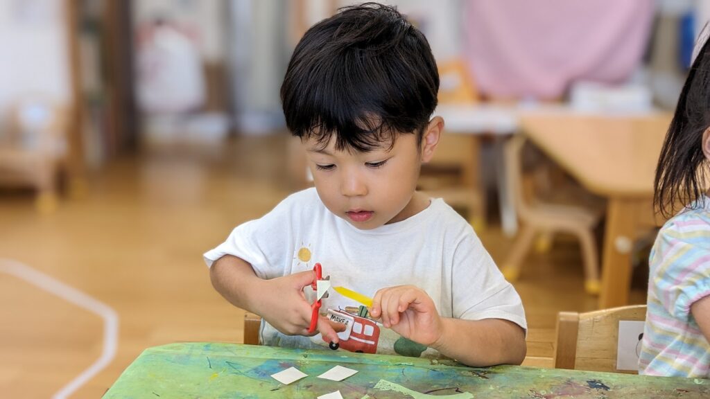 2歳児はハサミにも挑戦しました!真剣な表情です。