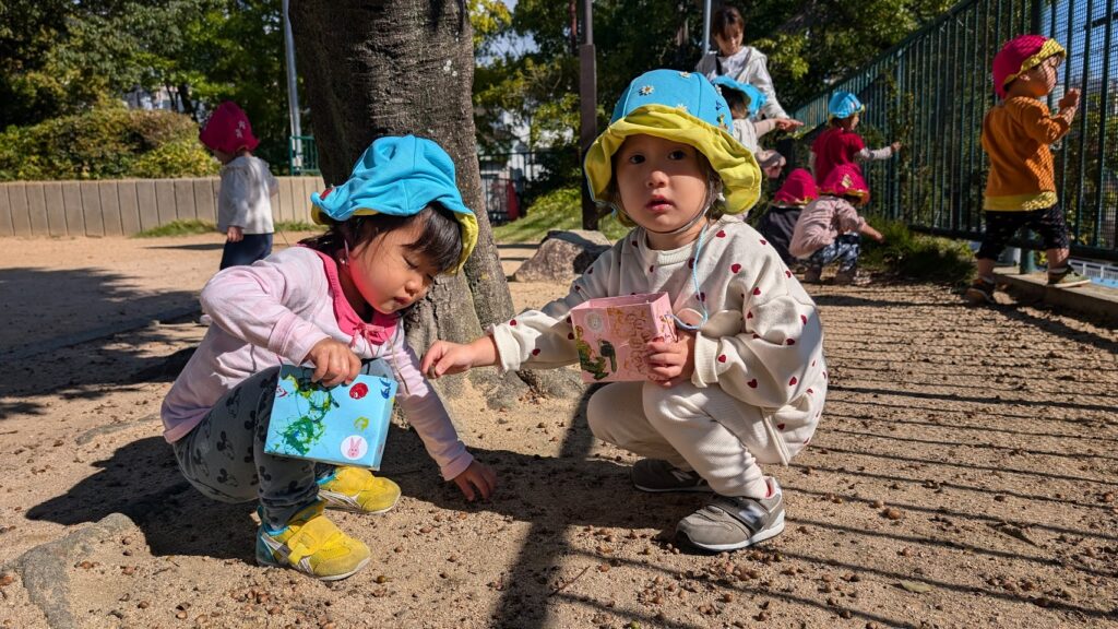 オリジナルお散歩バッグを作ってどんぐり拾い、落ち葉拾いにも行きました♪