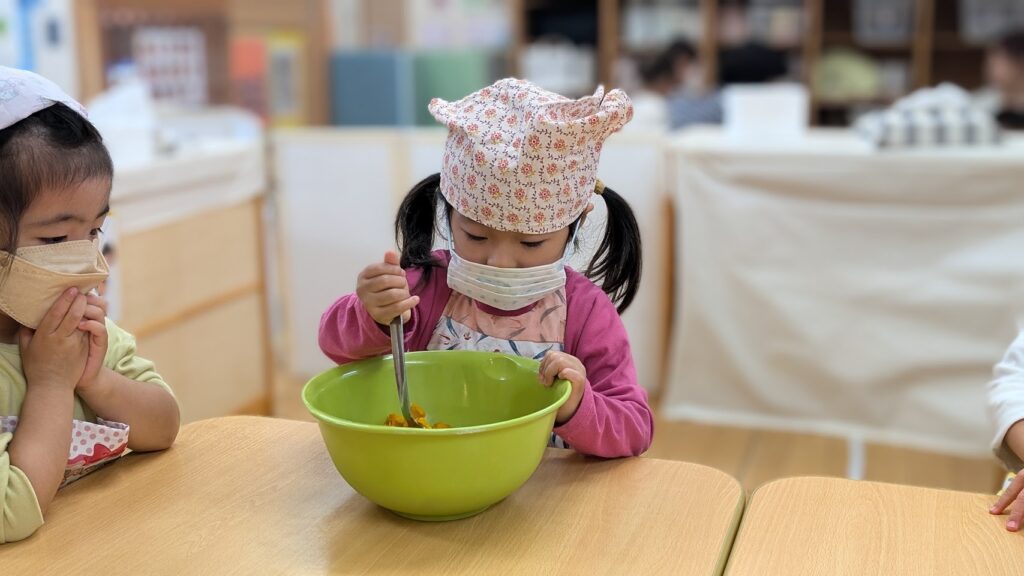 「おいしくなーれ!」と生地を上手に混ぜています♪