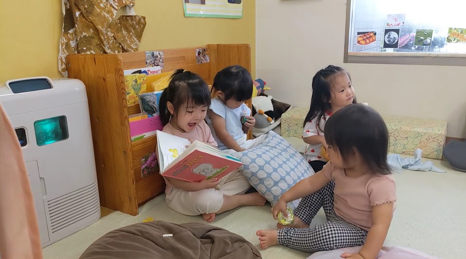 1歳児と2歳児の異年齢同士の関わりがグーンと増えて、先生のように「次のページにするよ♪」と絵本を読んでくれていました📗