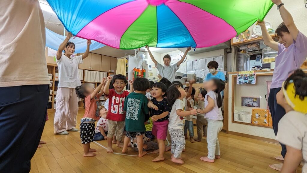 9月の誕生会では、なのは乳児園と一緒にパラバルーンを楽しみました。バルーンを広げると、