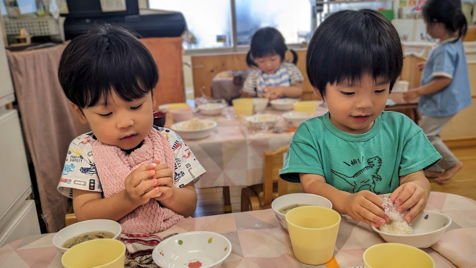 9月1日は、防災の日⛑この日の昼食は、「防災の日」メニューでした。 2歳児は、自分で塩おすびを“にぎにぎ”と握りました🍙