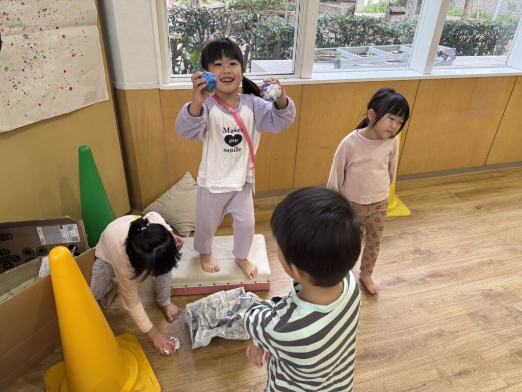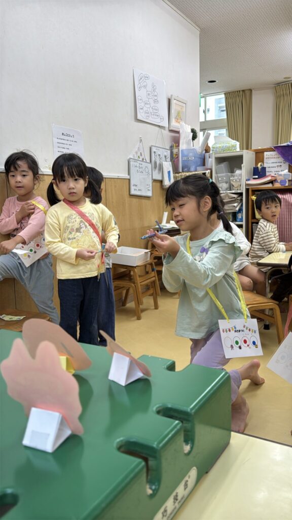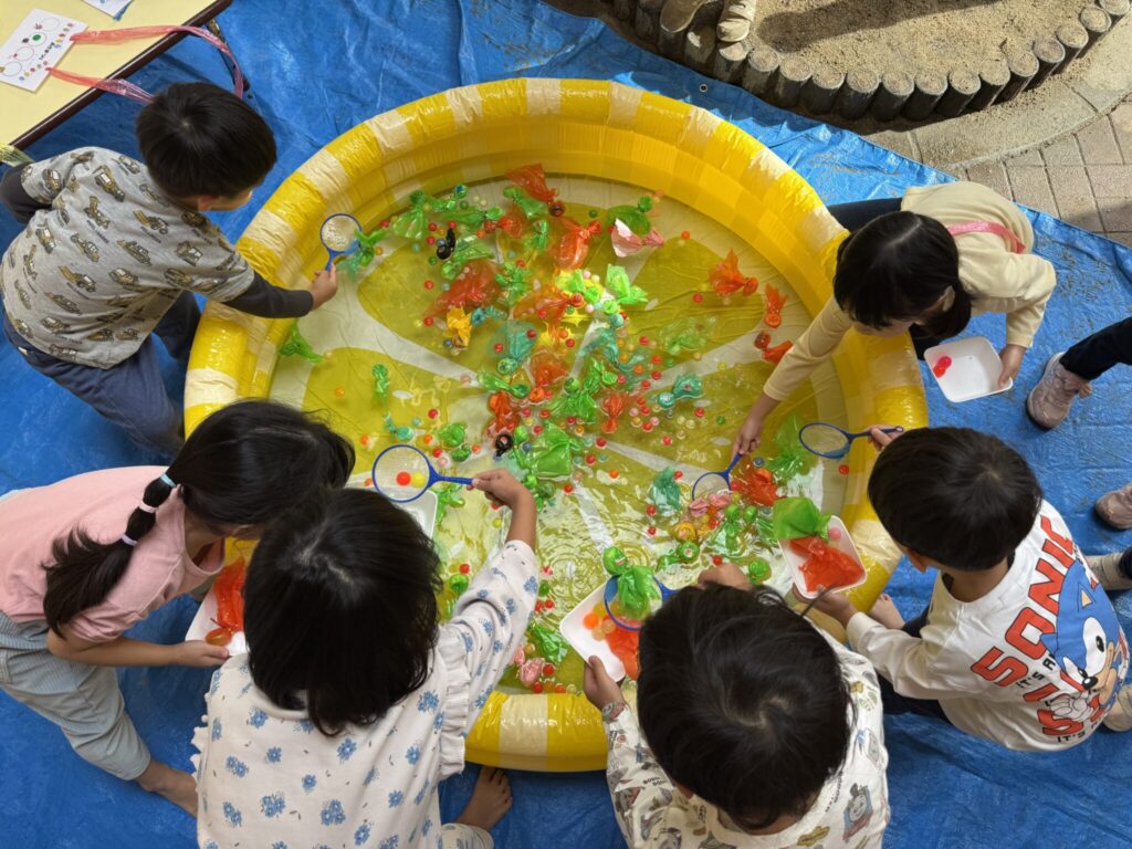 11月6日(木)に、幼児クラスで秋祭りを行ないました。異年齢のグループに分かれて「金魚すくい」「射的」「お化け屋敷」「宝さがし」の4つのブースを出しました。準備ではなんのお店を出すのかなど子ども達で話し合って決める姿がたくさん見られ、選んだ理由を友だちに伝えたり自分の意見を言葉にしたりする機会が沢山あったと思います。また、年上のお兄さんお姉さんに頼る姿がとても印象的で、お互いに声をかけながら異年齢でも協力することが出来ていました。当日は緊張する子どもたちの姿も見られましたが、それぞれが自分の役割を一生懸命やりきることができました。何度も回数を重ねるうちに、子ども達から積極的に声をかけ合いながらお店屋さんをすることができ、お客さんでブースを回る時にも楽しそうな笑顔をたくさん見ることが出来ました。