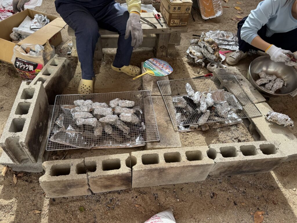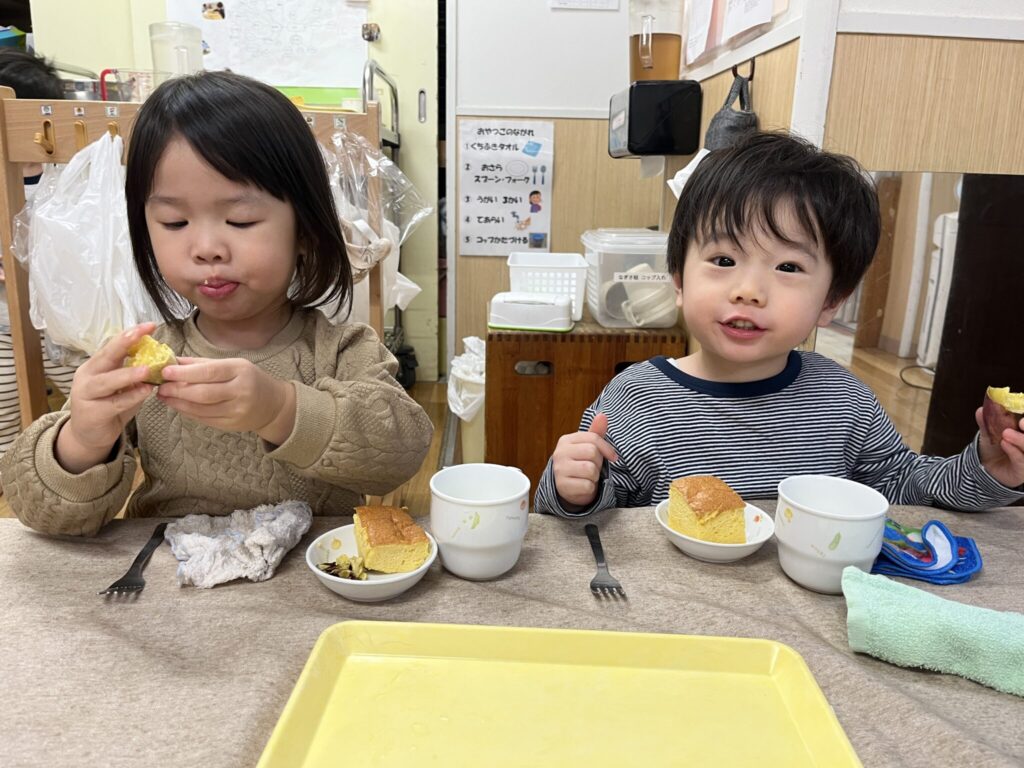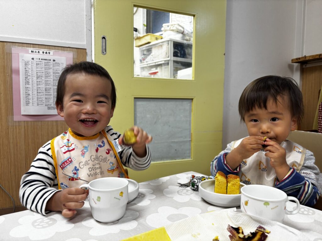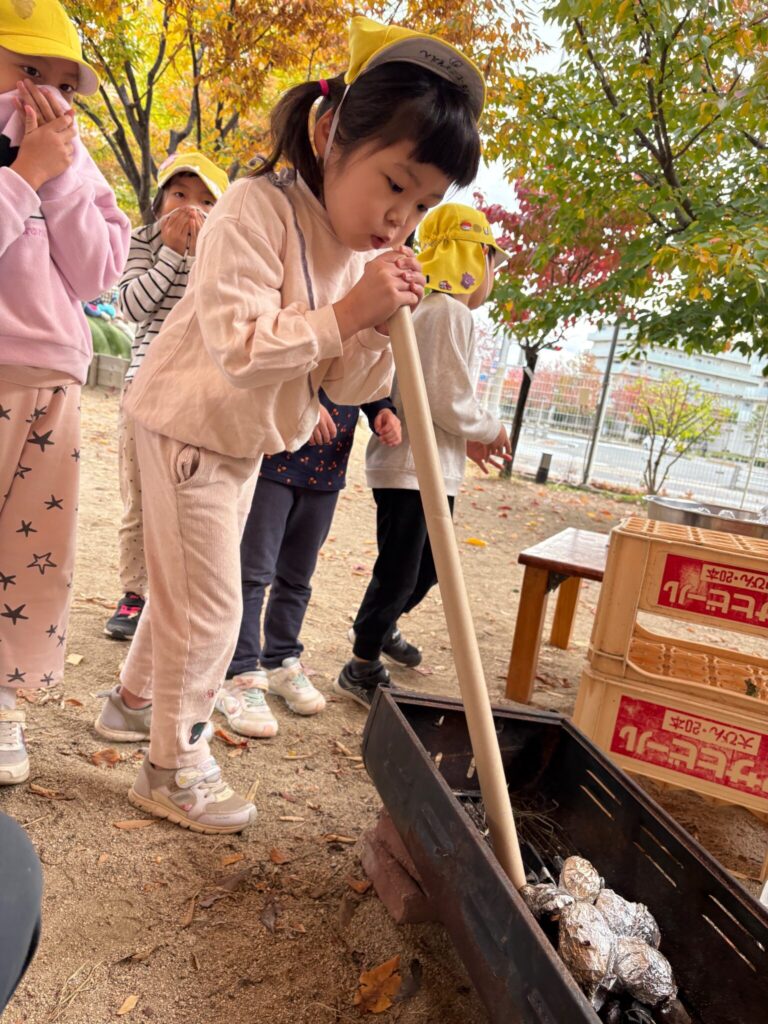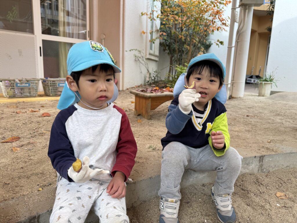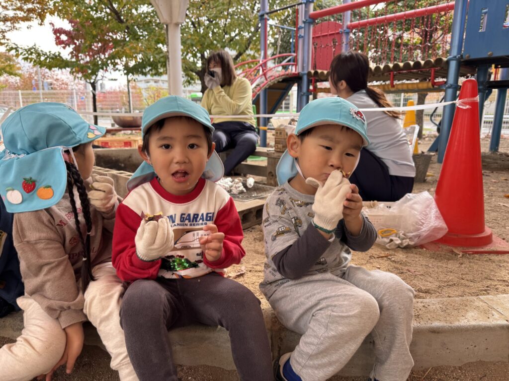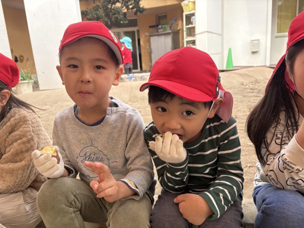11月18日(火)に、焼き芋大会がありました。前日に新聞紙とアルミホイルでさつまいもを包み、楽しみにしていた子ども達。火や煙が上がっているのを見て「目が痛い」「くさい」と様々な感想を口にしたり、少しずつ焼きあがっていく焼き芋に「まだかな」「早く食べたいな」と、目を輝かせながら出来上がりを楽しみに待っていました。じっくりと火で焼かれていく様子を見守る時間も、子ども達にとっては特別な体験だったようです。焼き上がった焼き芋を手にすると「おいしい!」「もっと食べたい!」と、あちこちで声があがっており、夢中になって食べていました。焼き芋大会を通して季節を感じたり、食べ物への関心がさらに深まった1日となりました。