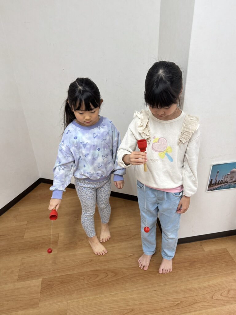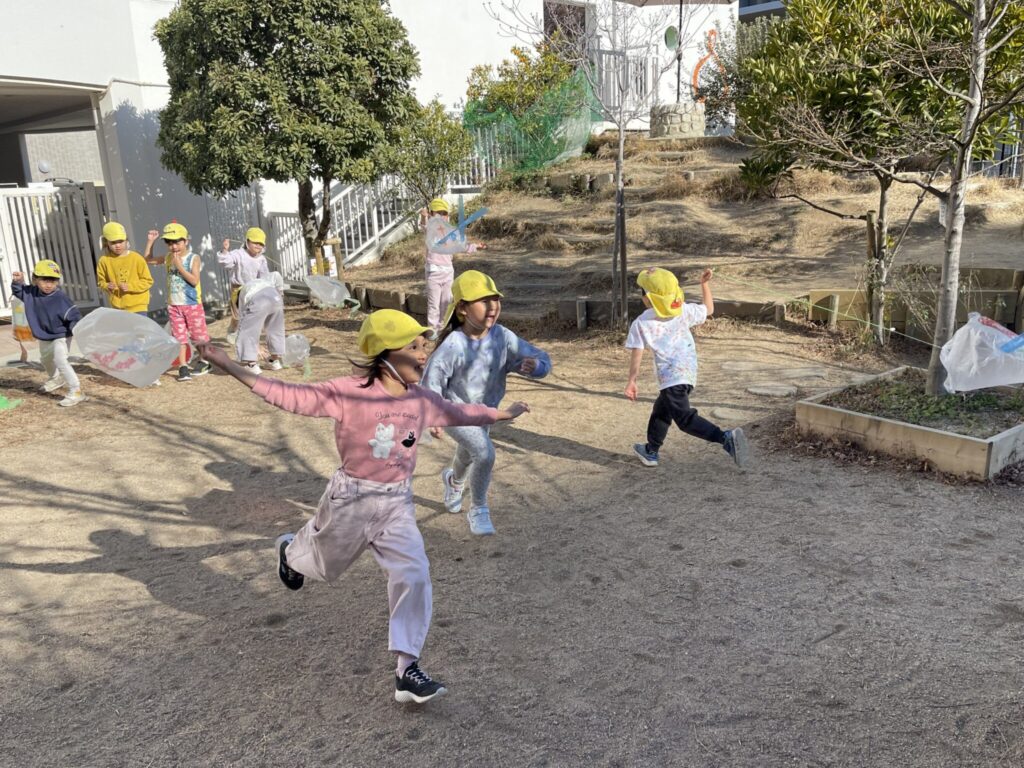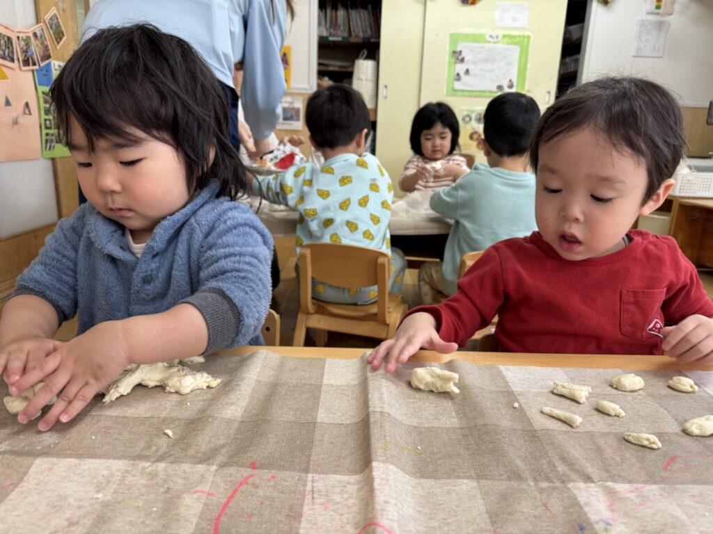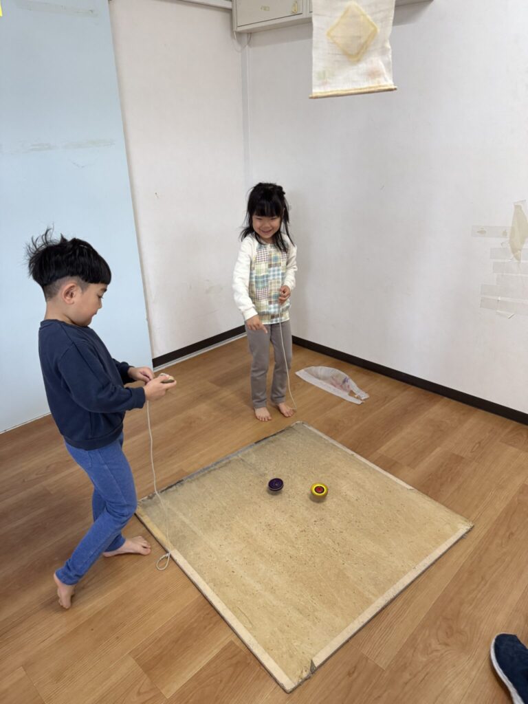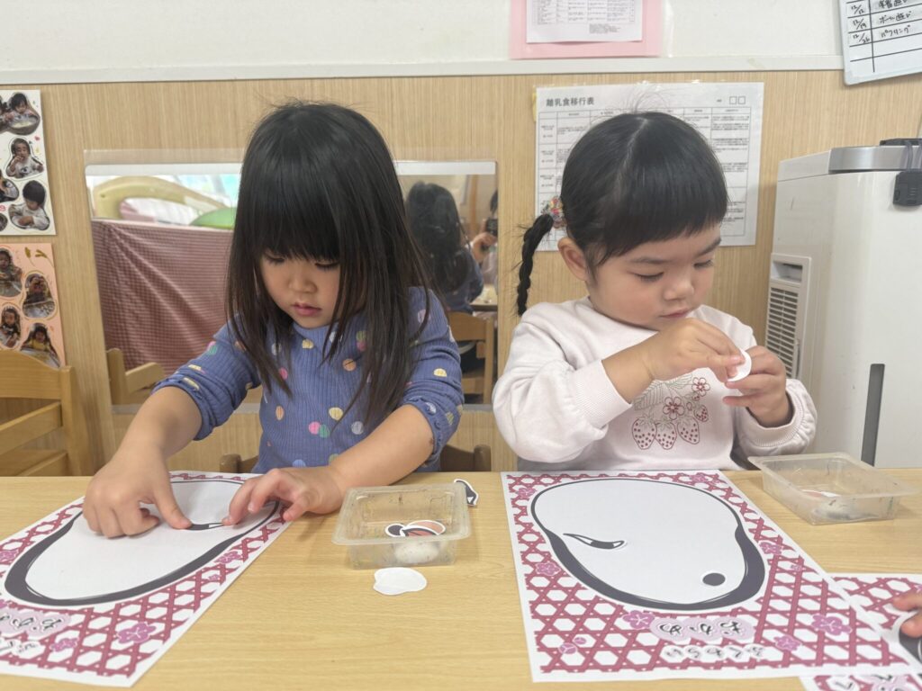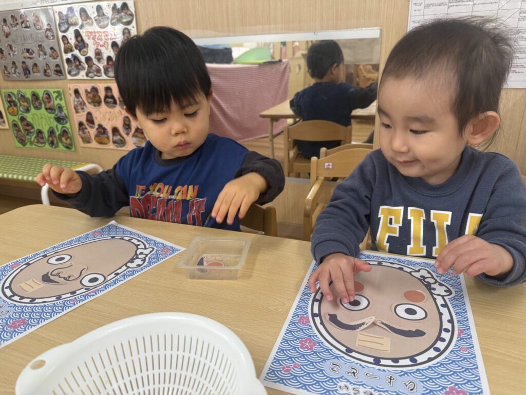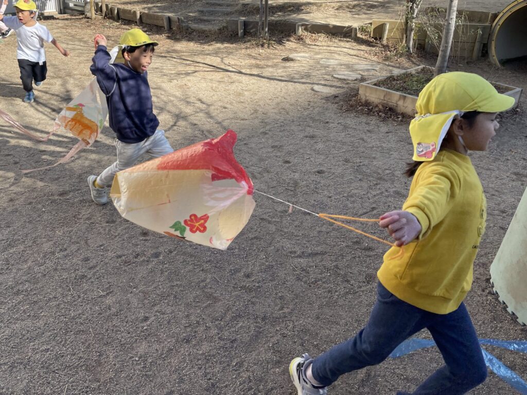新年を迎えて久しぶりの園生活にドキドキワクワクした子ども達の姿が見られます。今回は、正月遊びの様子をお伝えしたいと思います。乳児クラスや幼児クラスで、福笑いや餅つき、凧揚げ、コマ回しなどの正月遊びを楽しみました。福笑いでは、顔のパーツを言葉にしながら貼っていき、完成したものを友達と見せ合って笑い合ったり、嬉しそうにしたりする姿が見られました。餅つきでは、実際の餅つきのように手作りの臼と杵を使って、お餅に見立てた小麦粉粘土を友達と向かい合いながら「ペッタンペッタン」とつくことを楽しんでいました。コマ回しやけん玉は、できるまで何度も挑戦して上手くできた時には大喜びしていました。最後に凧揚げは、自分で絵を描いて凧作りをして、園庭で元気いっぱいに走って凧を揚げることに挑戦していました。正月遊びをきっかけに子ども達の素敵な表情が見られました。今年も週刊はっとを通して子ども達の様子をお伝えしていきます。よろしくお願いします。
