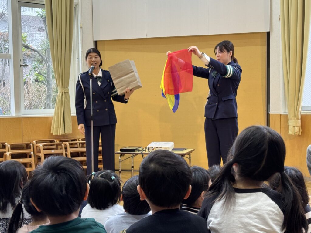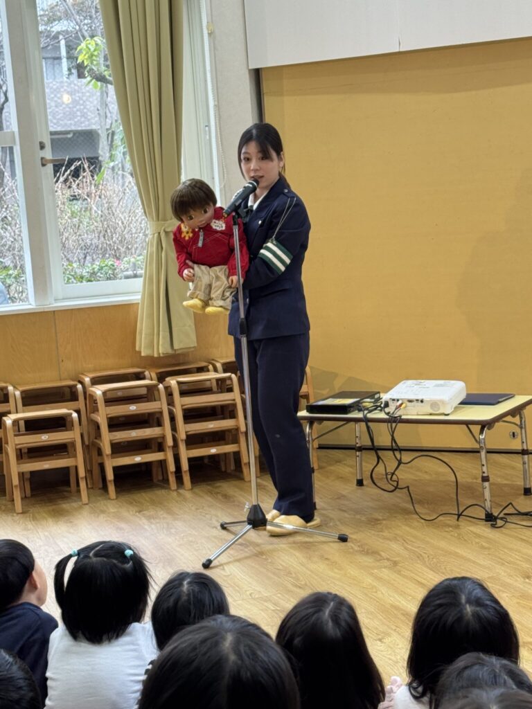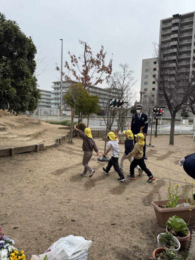 3月2日(月)に交通安全指導があり、全クラスが参加しました。信号機の赤、青、黄の意味について教えてもらい「青になったらまず止まる」などの約束をしました。けんちゃんという人形も登場し、腹話術を使って子ども達と対話したり、わかりやすい短編の映画で交通ルールを知ったりして命の大切さを学ぶことができました。また、かもめ組は園庭に出て実際に横断歩道を渡る練習もしました。警察署の方の話をよく聞いて率先して手を挙げて渡ってしました。