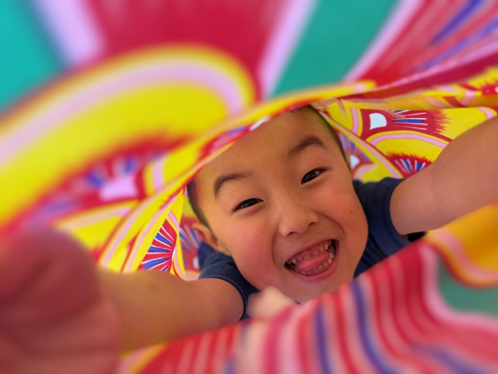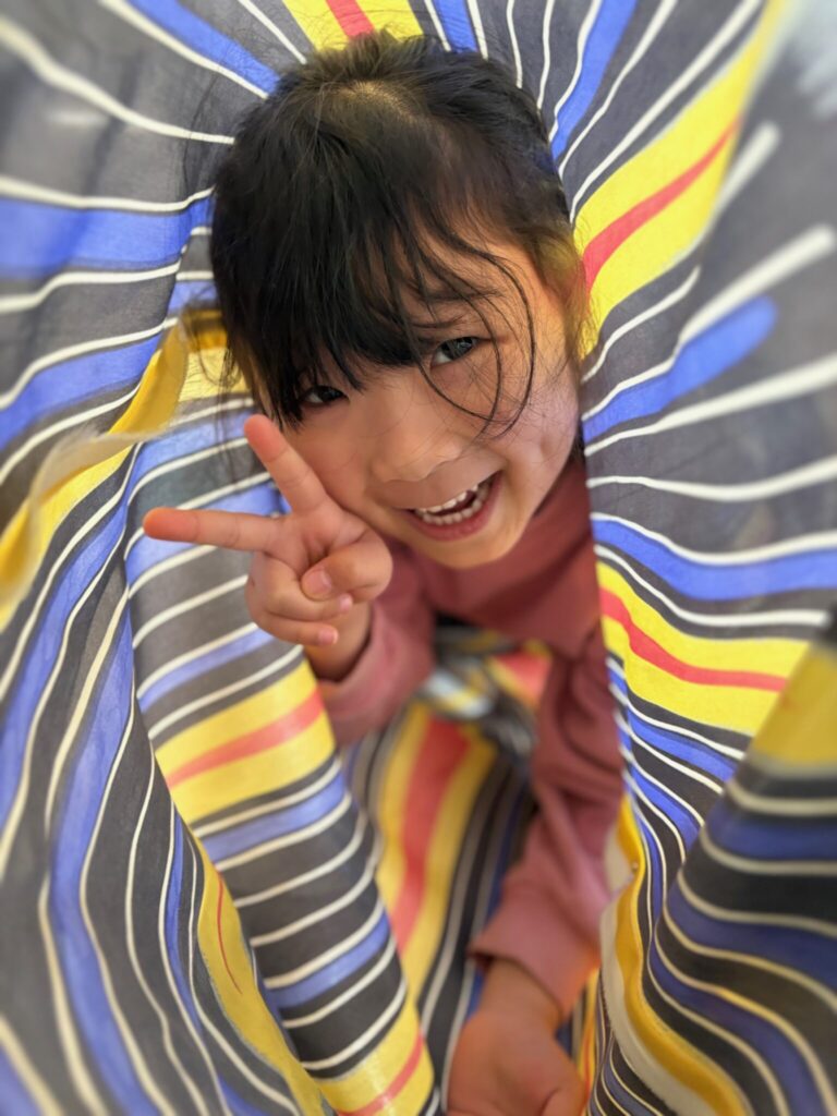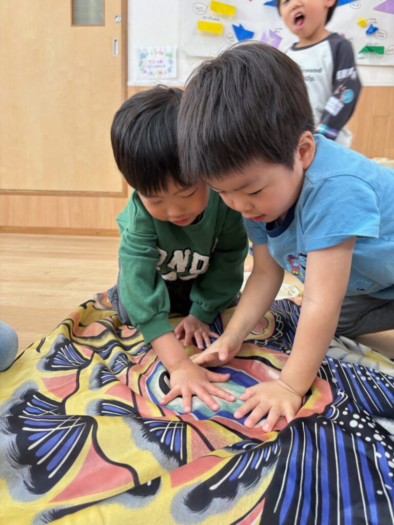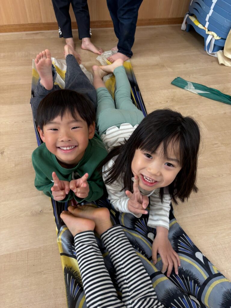 4月になり、はっとこども園には大きな鯉のぼりが上がりました。風に吹かれて、空を泳ぐ姿に、子ども達は大興奮でした。かもめ組ではそんな鯉のぼりに沢山触れて遊びました。いろいろな部屋を探しながら、ロフトで鯉のぼりを見つけ、箱から出すと「めちゃくちゃ大きい」と驚いていました。床に敷かれた鯉のぼりの上に皆で寝転がって、大きさを比べたり、目の大きさや、うろこの枚数なども観察してから遊びました。特に鯉のぼりくぐりにみんな夢中で、大きな鯉のぼりの中をトンネルのようにくぐって「次は誰が出てくる?」「せまーい」と大盛り上がりでした。友達とも鯉のぼりとも一緒にたくさん遊びました。