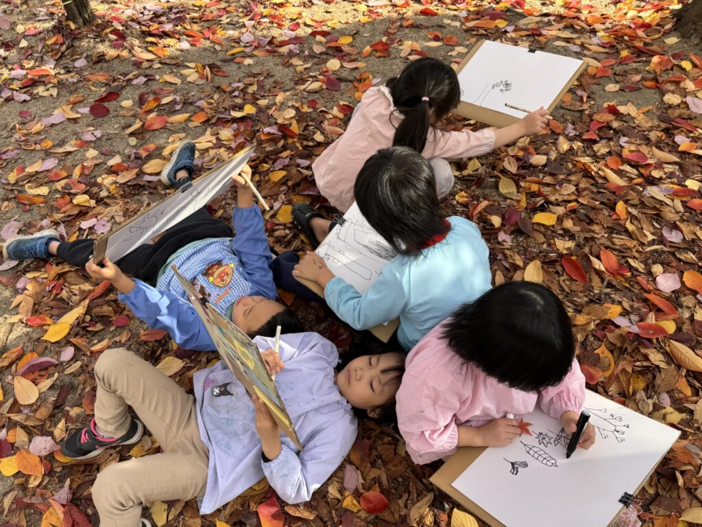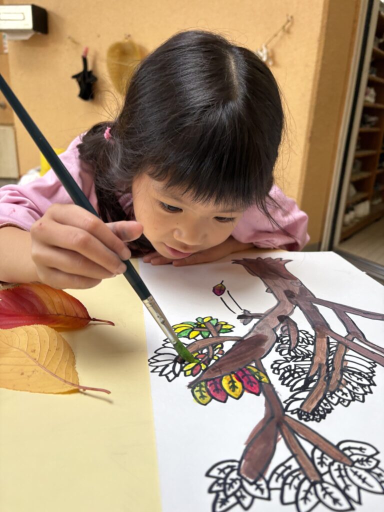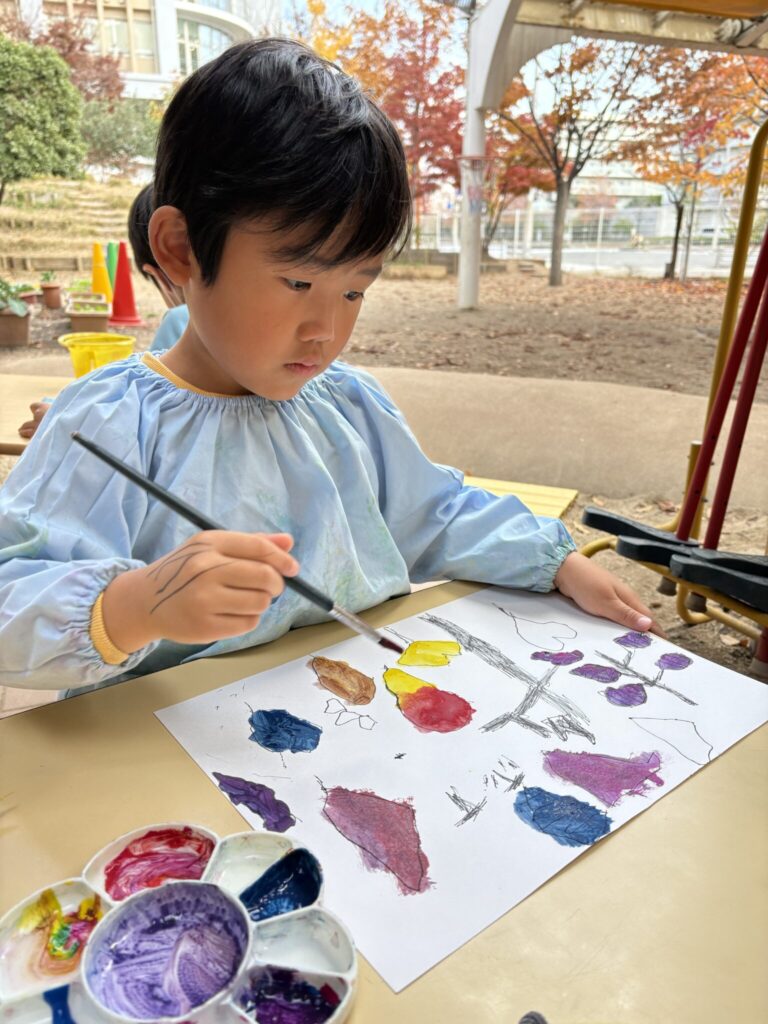 秋も深まり、園庭の木々の落とす色鮮やかな落ち葉に触れるなかで沢山の遊びが広がっています。かもめ組の子ども達は、好きな色や形の葉っぱがついた木を選び、築山に座ったり、沢山の落ち葉の上に寝転がったりと、それぞれ好きな場所、姿勢で写生を行ないました。じっくりと観察し、葉っぱの形や木の模様など、特徴を細かく捉えながら描こうとする姿が見られました。絵の具での着色は、どんぐりの木の下で行ないました。実際の葉っぱを隣に置いて同じ色を作ろうと試行錯誤したり「茶色はどうやって作るの」「オレンジにちょっと青を混ぜたらできるよ」と、友達同士教え合ったりする姿が見られました。自分なりに色を混ぜていくうちに偶然新しい色ができたり、葉っぱの形や木の幹にある模様に気付いたり、沢山の発見もありました。芸術の秋をめいいっぱい楽しむことができた子ども達でした。