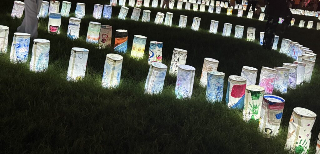 夕暮れとともに灯りがともされ、子どもたちの絵が浮かび上がる風景は、灘区の夏の風物詩となっています。