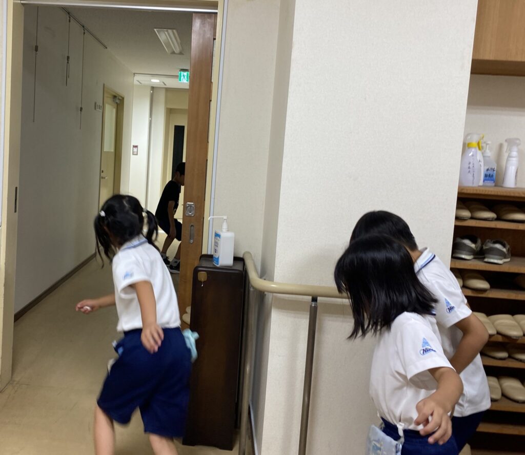 こども会議二日間を使って(地震が来た時にどうやって逃げる)かを各班に分かれて考えてみました。(1年生をまん中にして逃げる。)(階段は手すりを持って降りる。)(班行動で逃げる。)(また揺れるかもしれないのでそれに備える。)各班様々な意見が出ました。二日目には実際に自分達が考えた方法で逃げました。