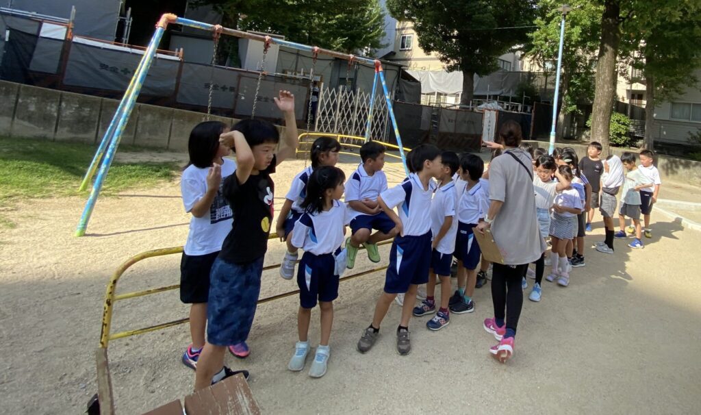 公園の真ん中で2列に並ぶ。所要時間6分でした。振り返りでは(上手に逃げられたと思う。)という子が多くいました。改善点もまだまだありますが何度も何度も訓練を重ねたいと思うし、万一地震が来た時は全員無事に逃げ切りたいと思います。
