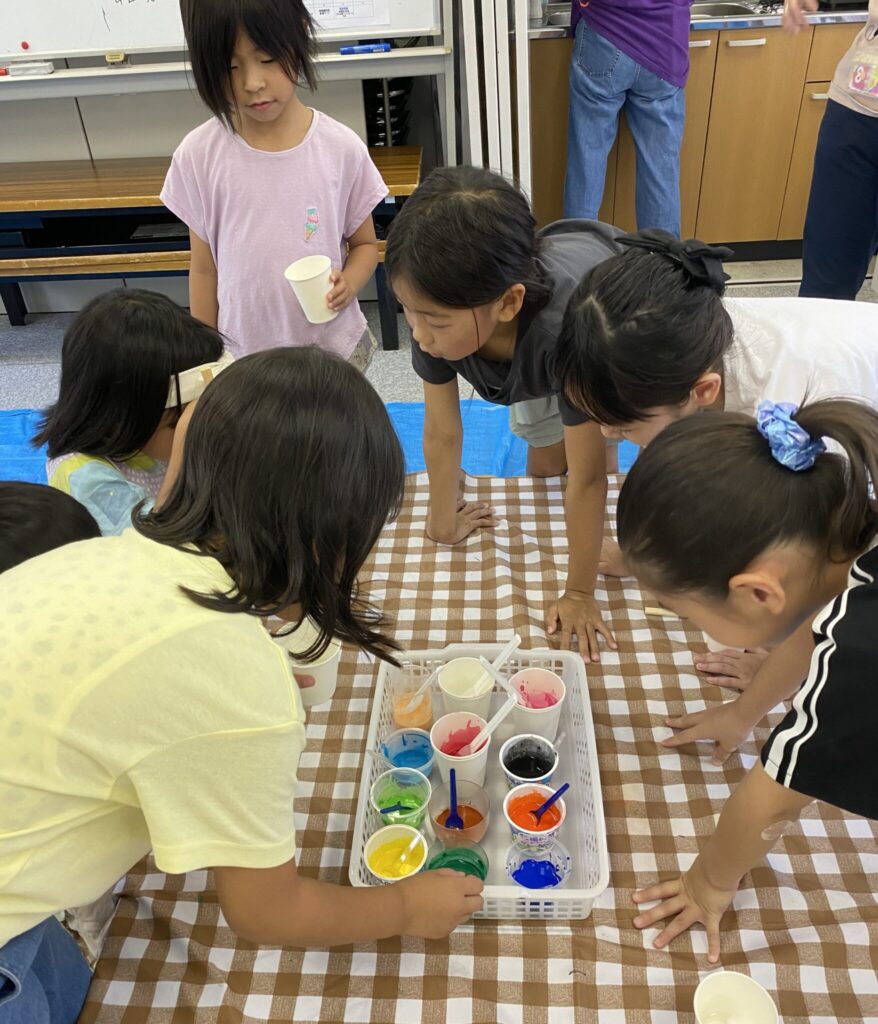 スライム作り。色とりどり、色んな硬さのスライムを作りました。