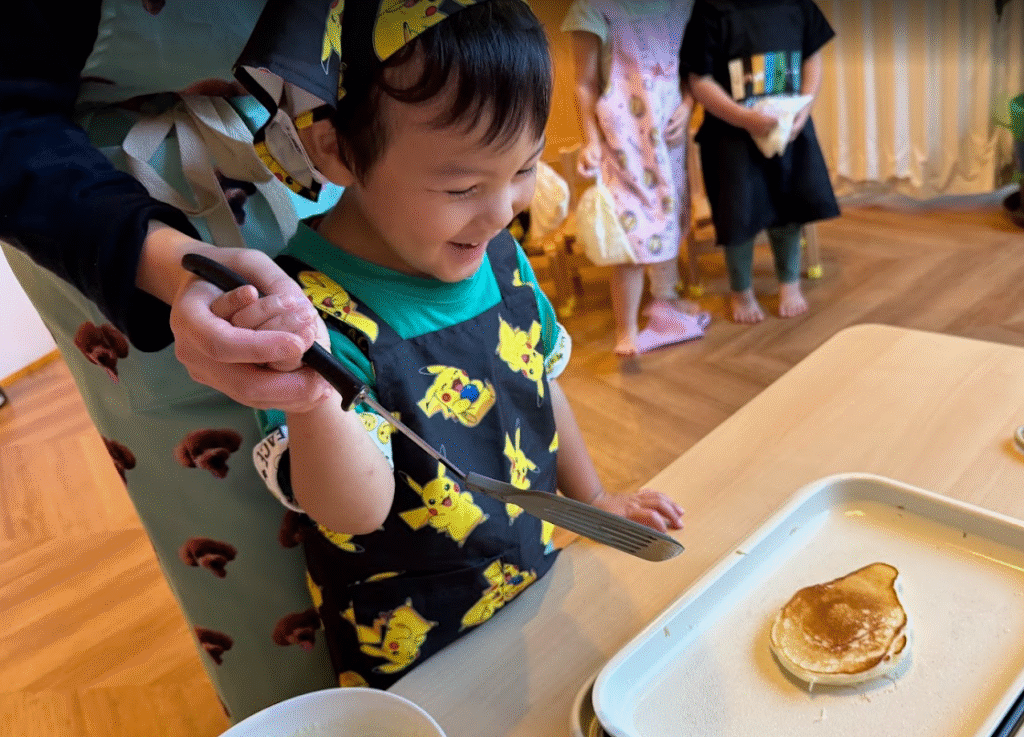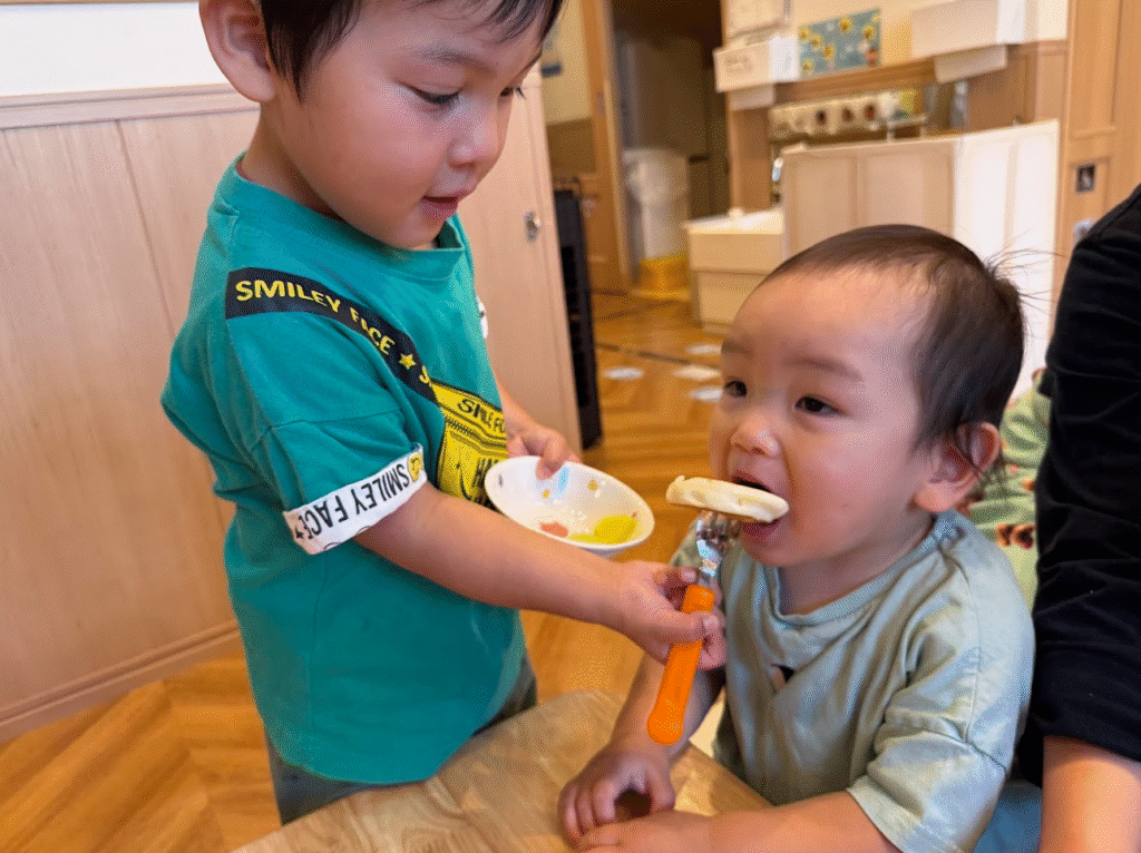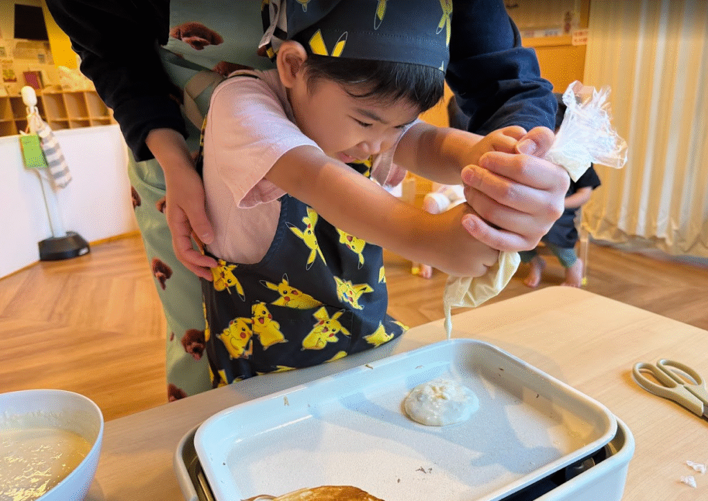 2歳児さんはホットケーキのクッキングをしました。近くのスーパーに買い物に行き、「重たいね~!」と一人ひとつエコバックを持って買った材料を持って帰りました。もみもみと粉と牛乳を混ぜたり、生地を絞ったり、ホットケーキをひっくり返したりと様々な過程に挑戦しました。また、完成したホットケーキを1歳児の友達や先生に「美味しいよ!どうぞ!」と食べてもらいました♪