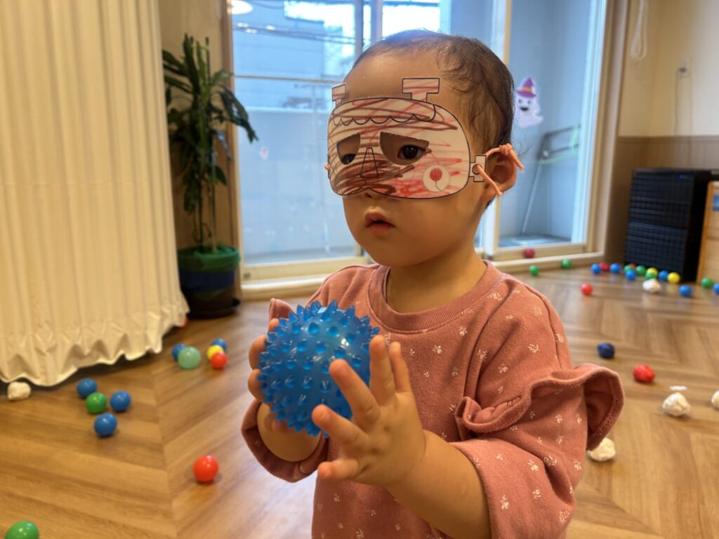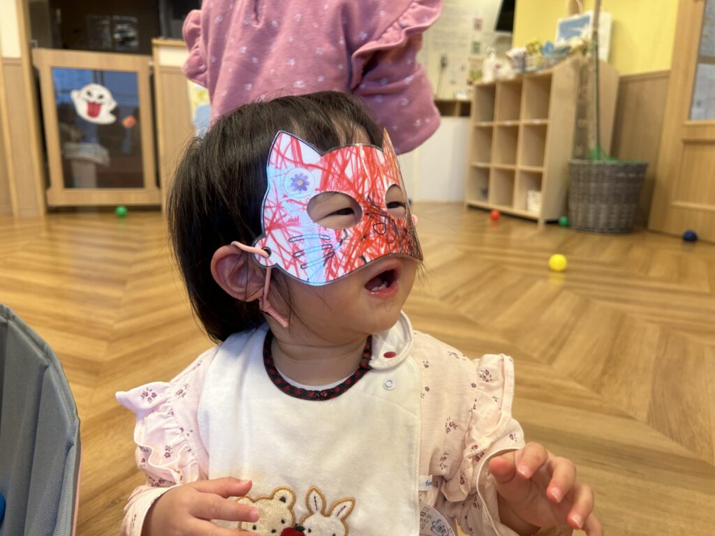 31日にはハロウィンパーティーをしました。作ったお面をつけてお菓子のイラスト宝探しをしたり、お化けの的当てを楽しみました。「おばけさんもおやつどうぞ!」とお菓子のイラストを食べさせてあげる姿もありました👻