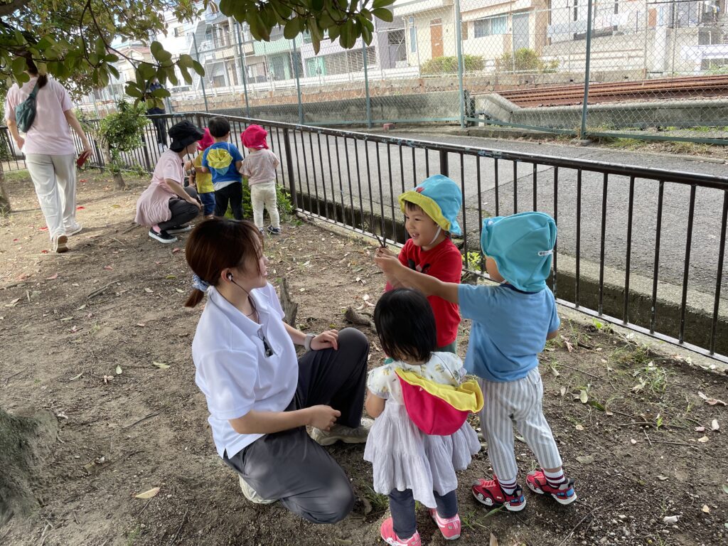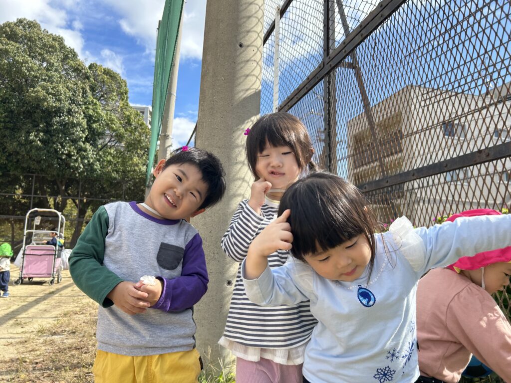 お外遊びが大好きな子ども達。過ごしやすい気候になり、公園で遊ぶ日が増えてきました。大好きな遊具で遊んだり、ボールやしっぽとりをしたりと思い思いに楽しんでいます。また、きれいなお花を見つけて髪飾りにしたり、どんぐりや木の実を拾ったりと季節を感じながら遊ぶ姿も見られます🍃
