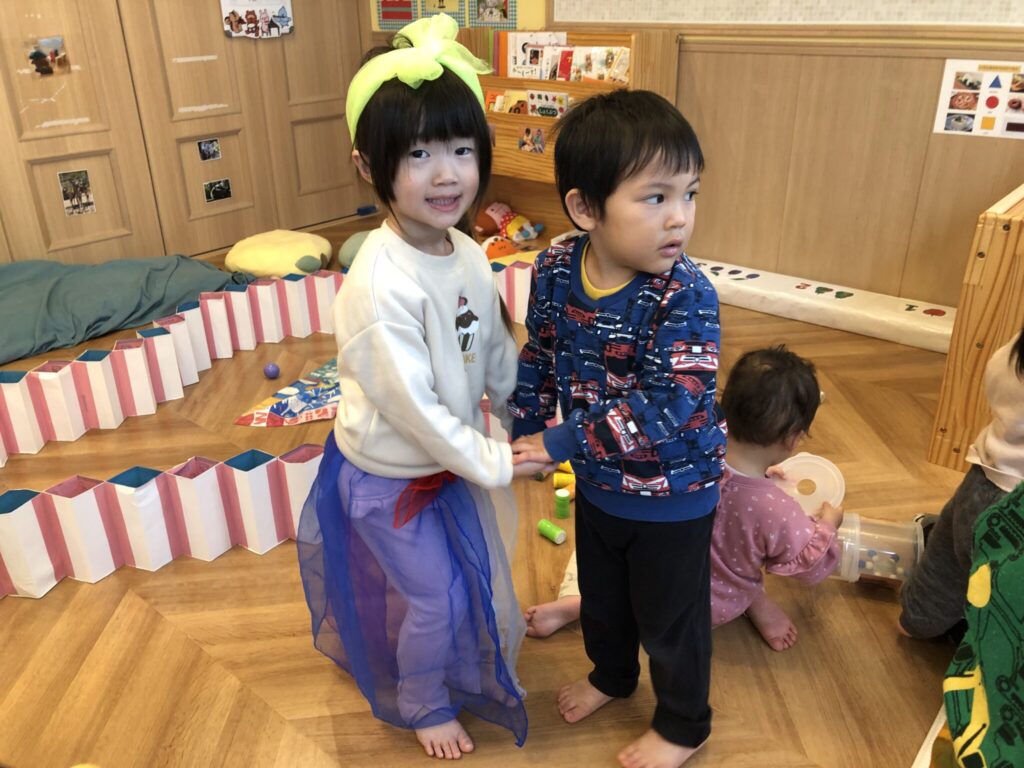 朝は室内でコーナーあそびを楽しんでいます。この日は、保育者が手作りで作ったじゃばらを使って、子ども達が主役の舞踏会が始まりました。カラーマントを付けたり、踊りのペアを決めて音楽に合わせて、思うままに踊る子ども達でしたよ♪★