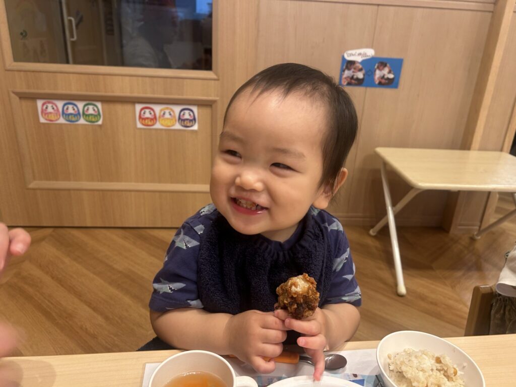 骨付きチキンをみて、「わぁ~!!おいしそう💖」と目を輝かせる子ども達でした!おいしかったね♡