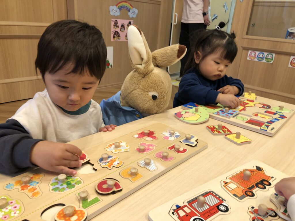 子ども達が自分であそびたいおもちゃを選び、机の上でじっくりとあそびこんでいます。