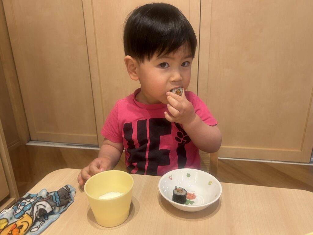 おやつは恵方巻!「おいしいね~♪」と味わって食べる子どもたちでした!