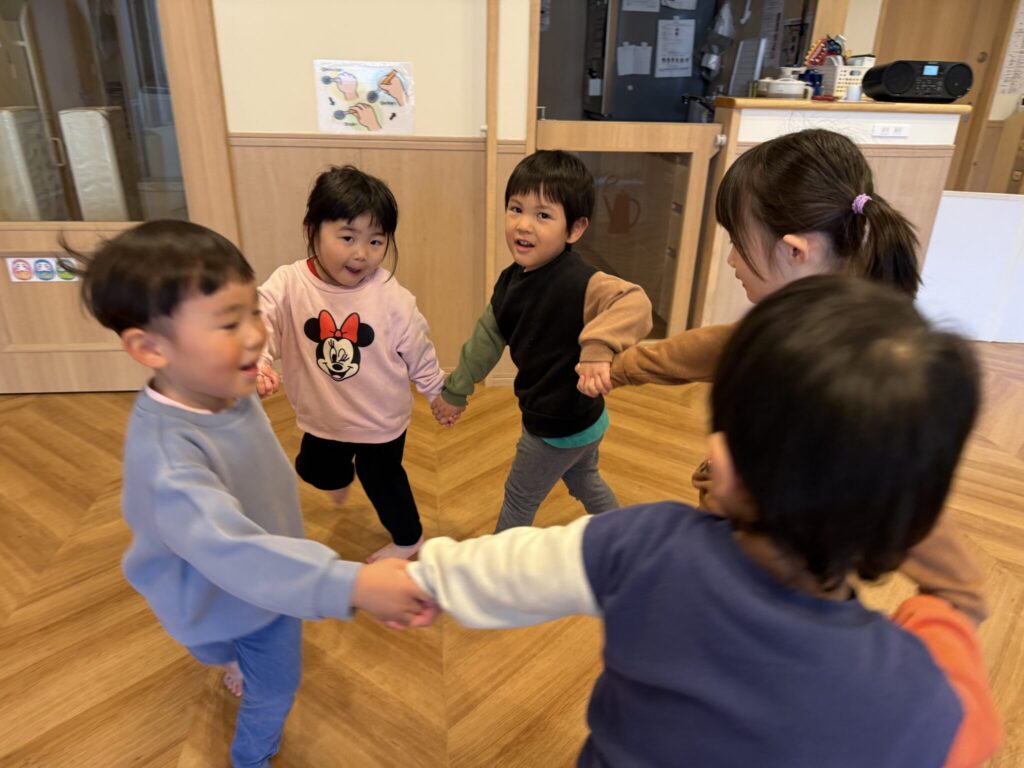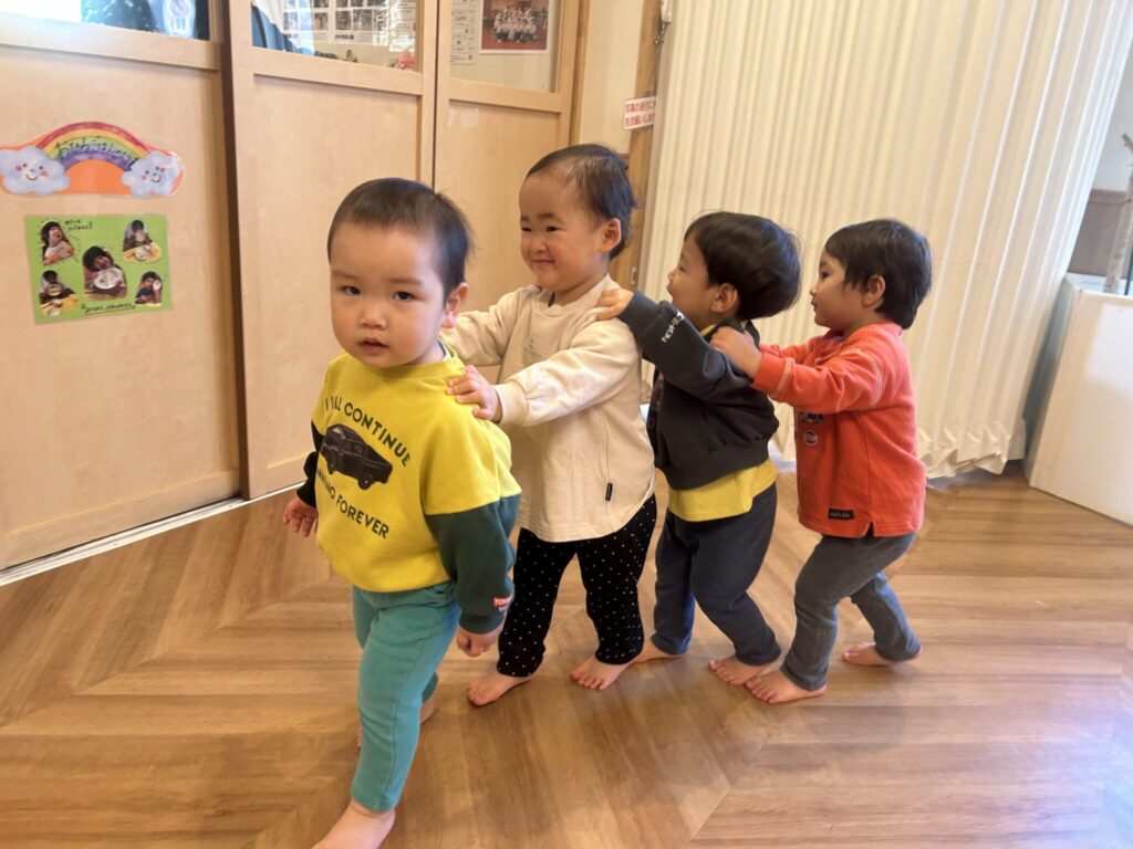ふれあいあそびの様子です♪「親子でメリーゴーランド」「でんしゃごっこ」をお友達と一緒に楽しんでいます!
