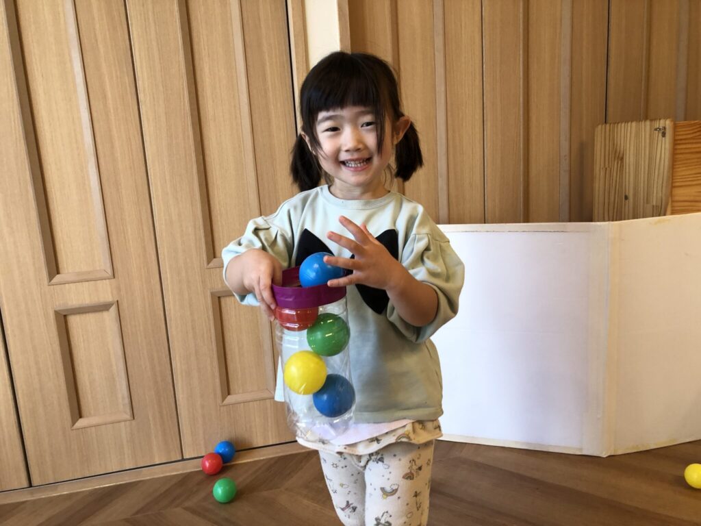 豆に見立てたカラーボールを投げ、「おにはそと!ふくはうち!」と節分の行事に親しみました。