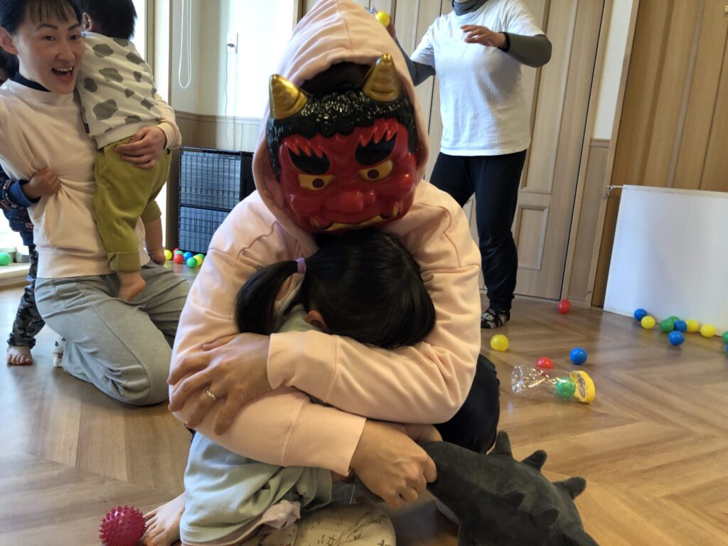 摩耶だいな乳児園に赤鬼がやってきました!怖くて泣いてしまうお友達もいましたが、最後は抱っこしてもらい、「ばいば~い!」と手を振る子ども達でした!
