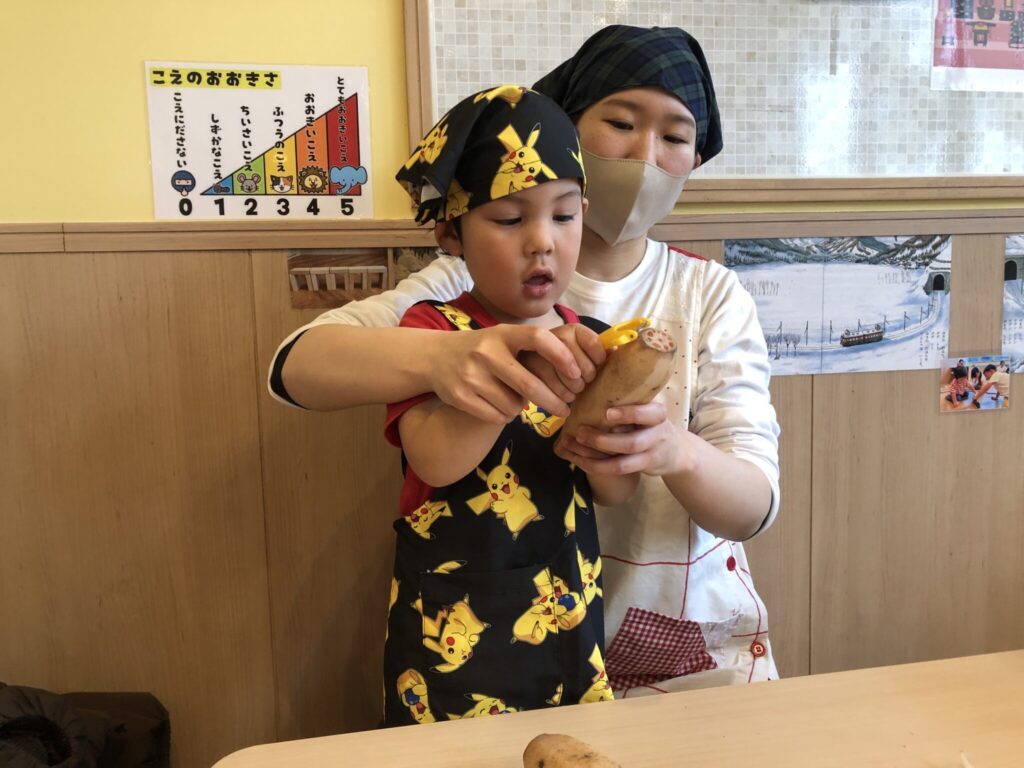 2月の食育はれんこん!栄養士の先生と一緒に、ピーラーで皮むきをしました!カレー炒めにしてみんなで美味しく食べました😋