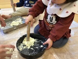 0歳アト組では小麦粉粘土をお餅に見立てて感触遊びを行いました。